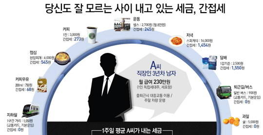 하루 이용료가 2700원이라고 가정하면, 245원의 부가세를 내는 셈이다. 담배에 매겨진 간접세는 다른 제품보다 상당히 많다. 2500원짜리 기준으로 부가가치세와 담배소비세, 교육세, 폐기물 부담금, 국민건강진흥기금(준조세)을 합쳐 총 1540원이 붙는다. 지하철과 버스 등 공공 교통수단과 과일 등 농산품을 살 때는 간접세가 붙지 않는다. 이렇게 A씨는 평일 하루 4125원의 간접세를 낸다.